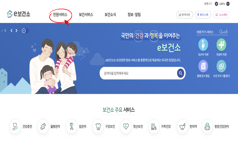 2. 홈페이지 상단의 [민원서비스] 메뉴를 선택해 주세요.